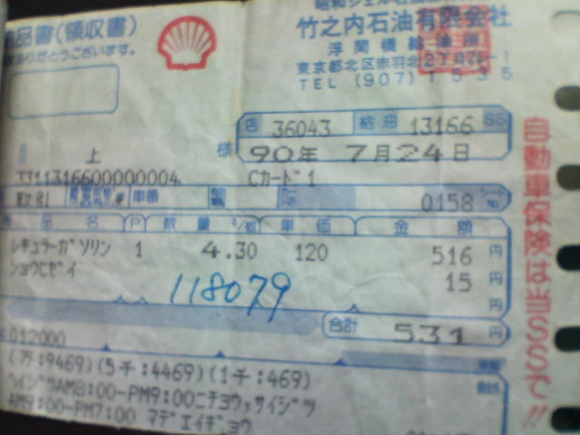 部屋の要らない物をあれやこれや捨てていたら古いガソリンスタンドの伝票が出てきた。